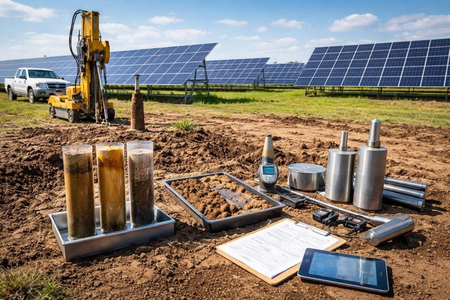 Baugrundprüfung für PV-Anlagen: Wie bodenmechanische Analysen Fundamente, Tragfähigkeit und Langlebigkeit von Solaranlagen sichern.